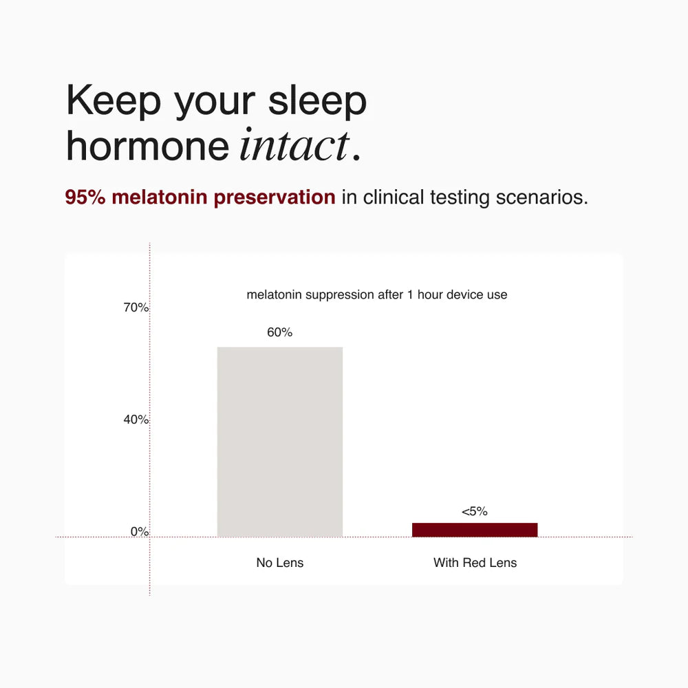 Standard screens suppress melatonin by over 60% in just one hour. Our red lenses preserve 95% of your melatonin, so your body stays in night mode and your sleep cycle stays on track.
