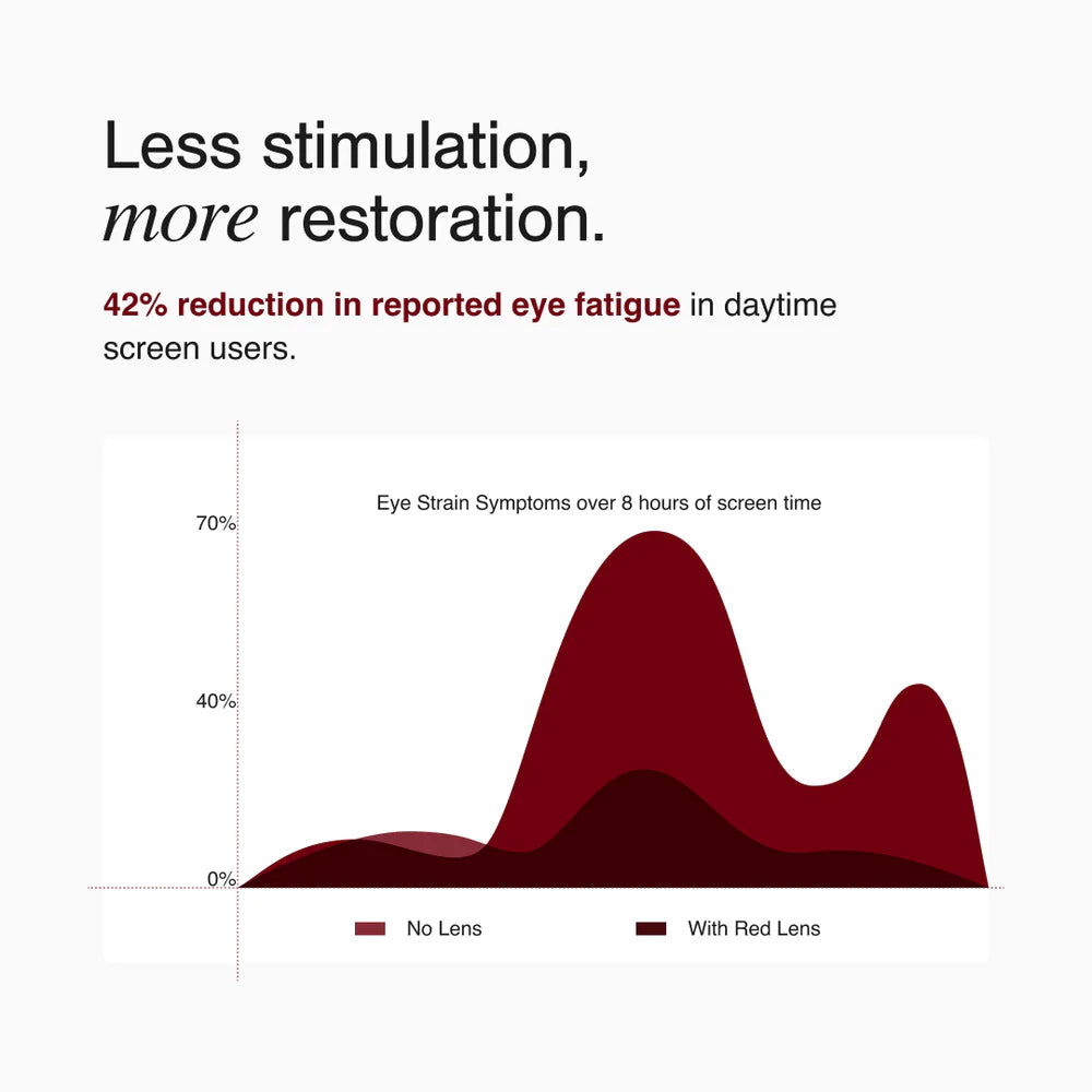 Clear lenses stop short. Red lenses go deeper—blocking 99% of the blue light that tricks your brain into ‘daytime mode', so you can finally sleep better and feel better.