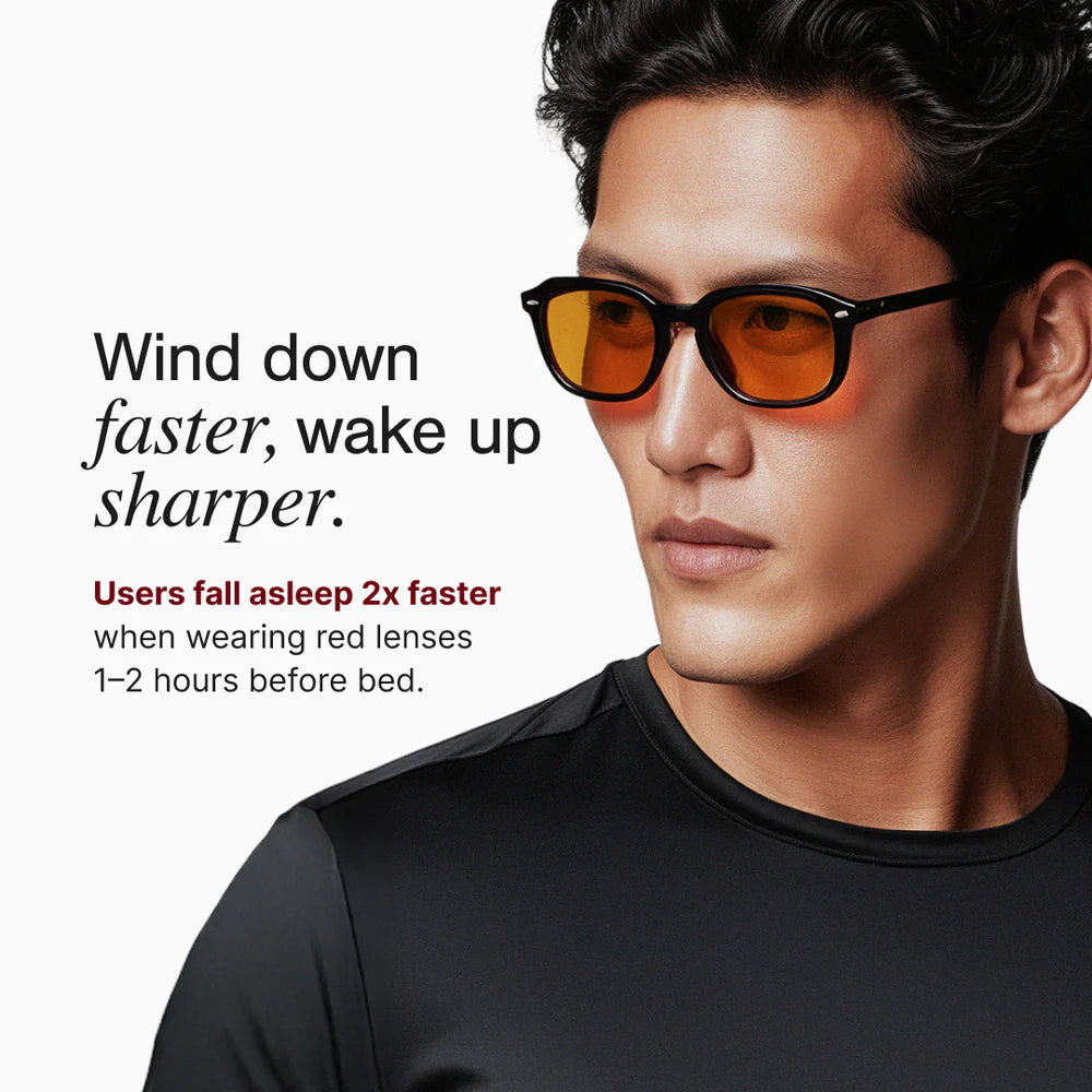Fall asleep up to 2x faster by wearing red lenses 1–2 hours before bed. No pills, no grogginess just your body’s natural rhythm restored so you wake up energized and focused.